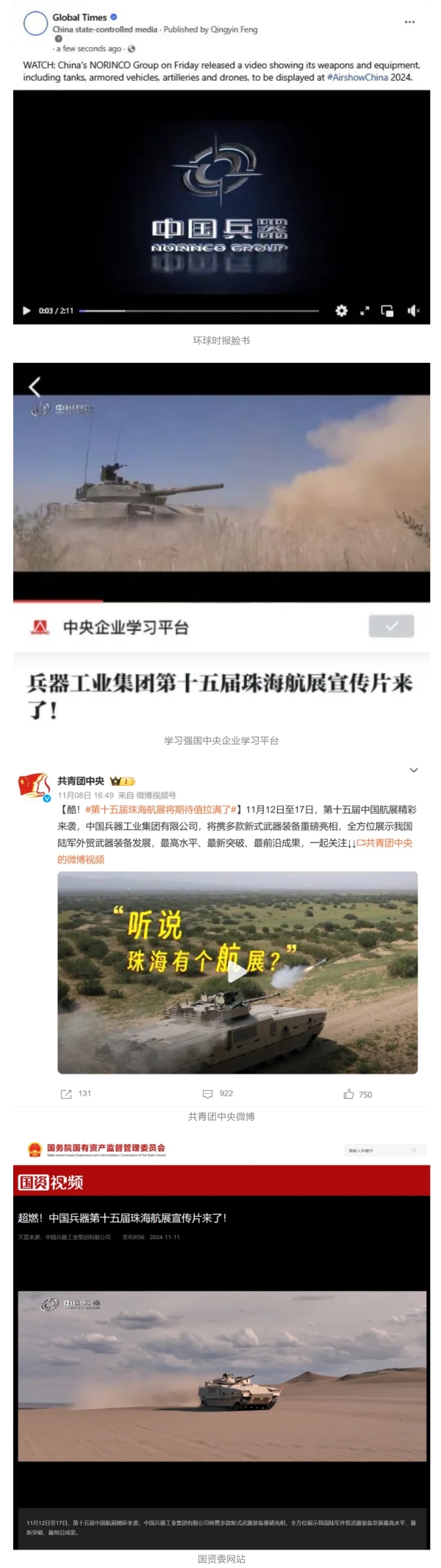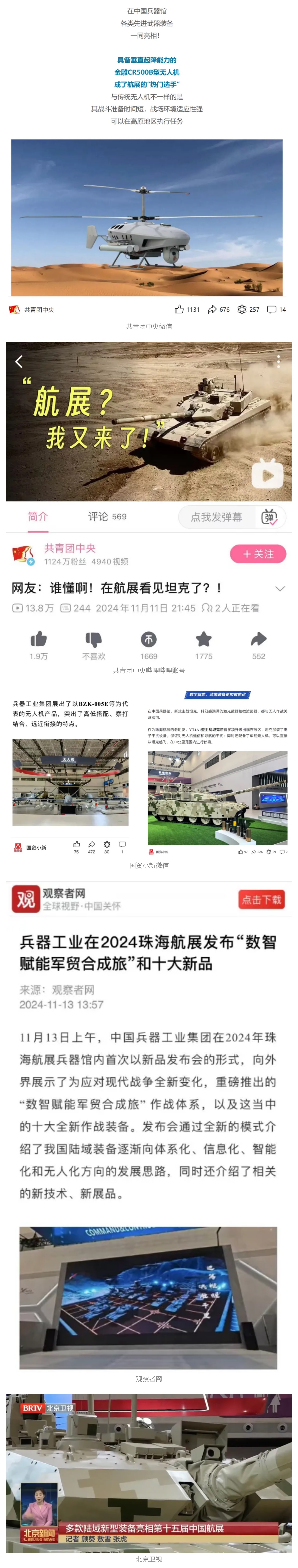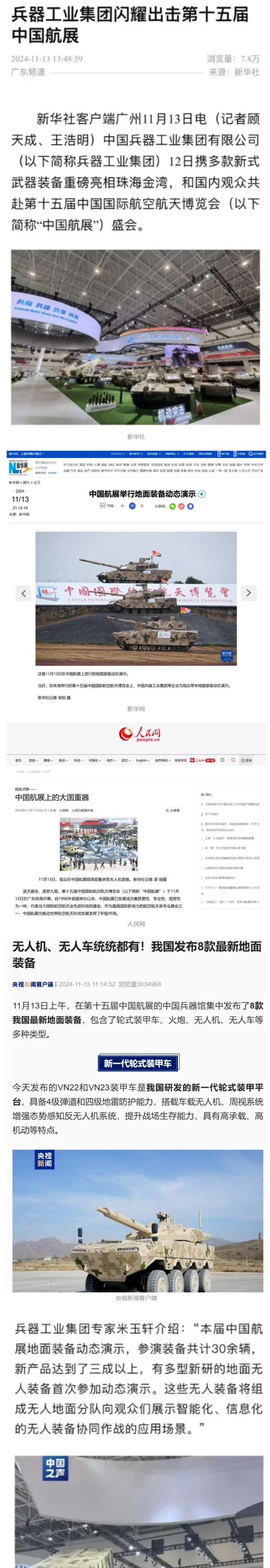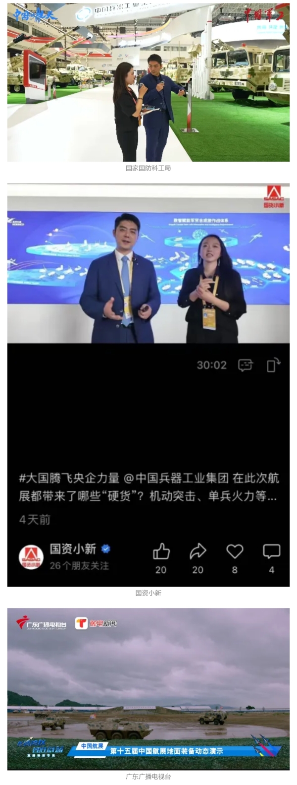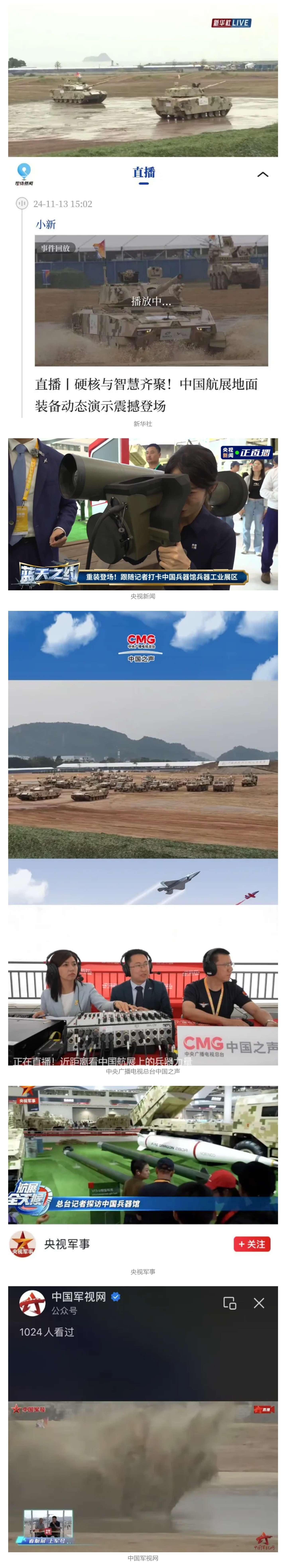 新華社、央視新聞、中央廣播電視總臺中國之聲、央視軍事、中國軍視網(wǎng)、廣東廣播電視臺等媒體以及國家國防科工局、國資小新等到兵器工業(yè)集團地面動態(tài)演示區(qū)、中國兵器館進行了直播。